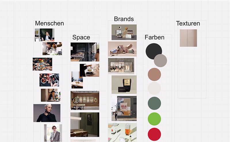 Im zweiten Schritt übersetzen wir das Markenfundament in eine visuelle Positionierung. Dafür erstellen wir ein umfangreiches Moodboard, das durch Bilder, Farben und Stimmungen mehr transportiert als Worte allein. So wird sichtbar, wie sich die Marke anfühlen soll und welche Emotionen sie bei der Zielgruppe auslösen kann.